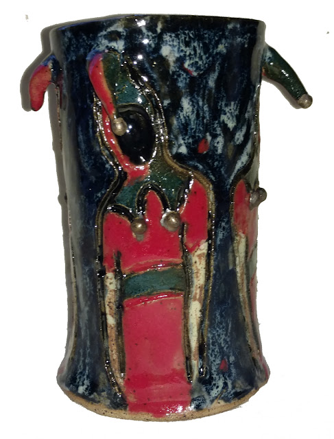 One of the hat baubles broke off while I was glazing it. I glued it back on and had it glaze fired. The kiln appears to have underfired. I like the matte red and green, but I want the background to be the glossy black with floating milky white. Refiring. The good news is that the glued bauble survived.